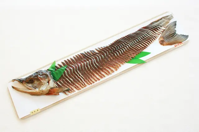 塩引鮭と同様に「塩引き」「洗い」という工程を経て、冬の季節風に晒します。塩引鮭と大きく異なるのは干し上げる期間で約半年の日陰干しで塩引鮭とは全く違うものに仕上がります。冬の寒風に晒し、初夏までゆっくりと干し上げ、旨味の熟成と凝縮を促し独特の風味が生み出されます。